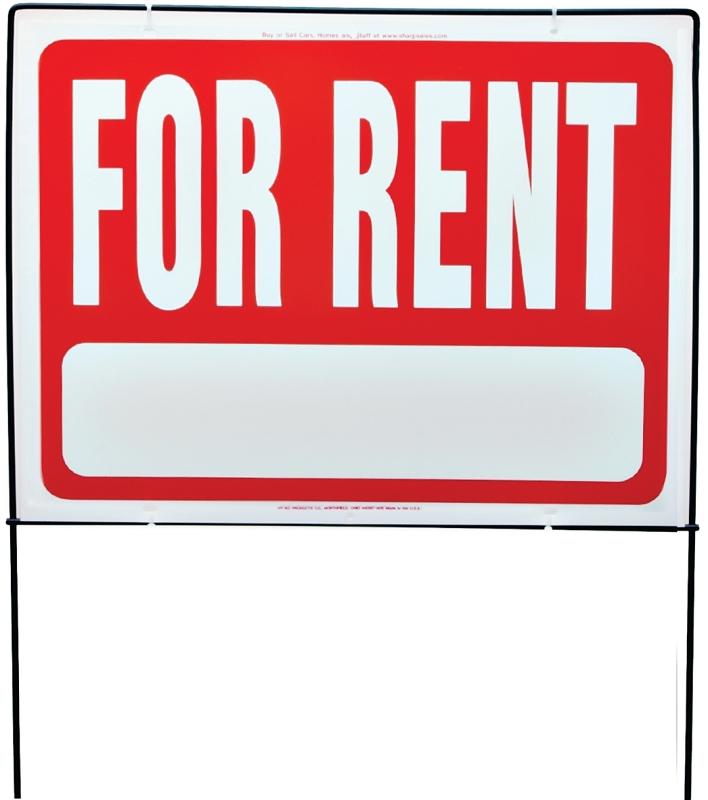 weather-resistant. Double-sided, bold lettering maximizes visibility. Sign comes attached to frame, no installation necessary. Red background with white lettering. Sign states "FOR RENT".