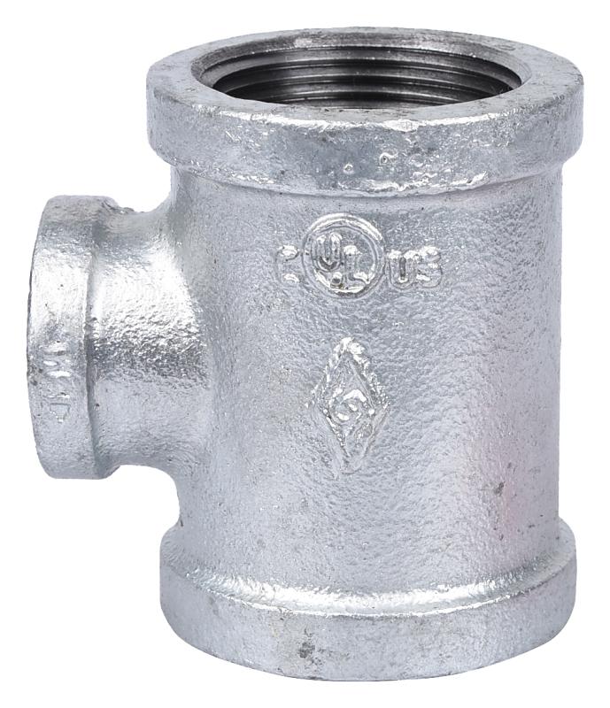 This galvanized tee is used to change direction in piping for use with water or steam. It meets ANSI standard with flat banded, right hand threads standard screw.