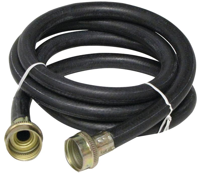 Rubber washing machine hose. For both hot or cold water. IO couplings on straight end for positive seal. Specially compounded to resist hot water softening action. Burst pressure, 800 lb. Highest quality. Identical to original equipment hose. Female and female coupling.