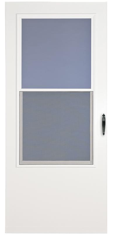 Self-storing window and screen for bottom ventilation. Solid wood core with maintenance free vinyl finish. Durable weather-stripping. Bottom expander conforms to uneven sills. One black adjustable speed closer. Reversible hinge for right or left mounts. Hardware durable pushbutton handle.