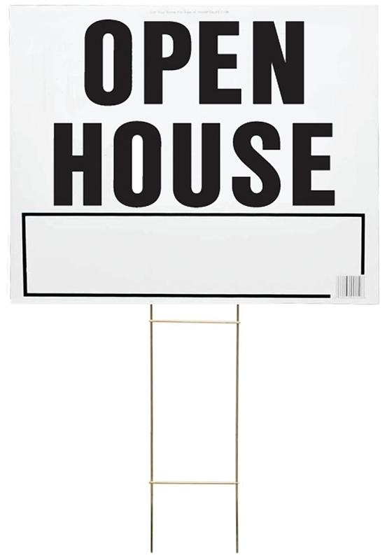 2-Sided, weatherproof. Includes one 24 in mounting bracket made of black steel, inserted between the corrugated openings. Sign states "OPEN HOUSE".