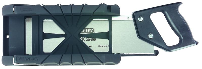 New storage system, holds all 12" x 14" Stanley backsaws. Finger button allows easy release of saw from storage cavity, 90, 45, and 22-1/2 degree mitre slots. Holes in base for fastening to a workbench. Made from lightweight, high-impact ABS plastic. Can be used with either back or panel saws, open interior allows cuttings to fall through, integrated pencil pocket.