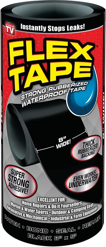 Flex Tape® is a super strong, rubberized, waterproof tape that can patch, bond, seal and repair virtually anything. It is specially formulated with a thick, flexible, rubberized backing that conforms to any shape or object. This durable adhesive tape instantly seals out water, air and moisture to create a super strong, flexible, watertight barrier. Unlike other tapes available, Flex Tape’s bond will increase with time and pressure.