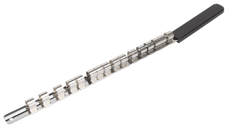 The Vulcan socket clip rail is made from chrome-plated steel. The clip rail is for 1/2 in sockets and holds up to 16 sockets for easy storage.