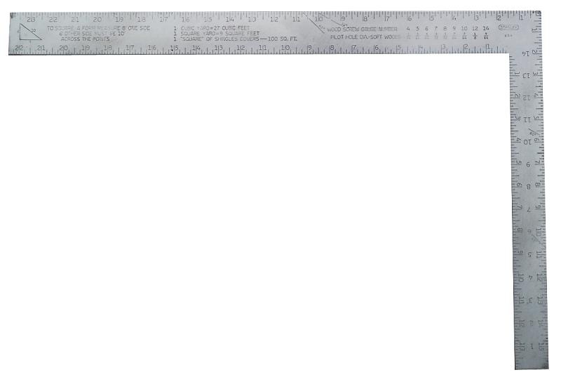High-quality aluminum for maximum durability. Protective lacquered coating resists corrosion. Durable black embossed graduations and figures for easy reading. Provides helpful reference conversion tables such as new lumber scale, decimal equivalent table, metric conversion table, formula for squaring a foundation, 45, 60 and 30 deg angle markings, volume and area formulas, wood screw gauge table, nail sizes (common and finish), quantity per pound and depth scale.
