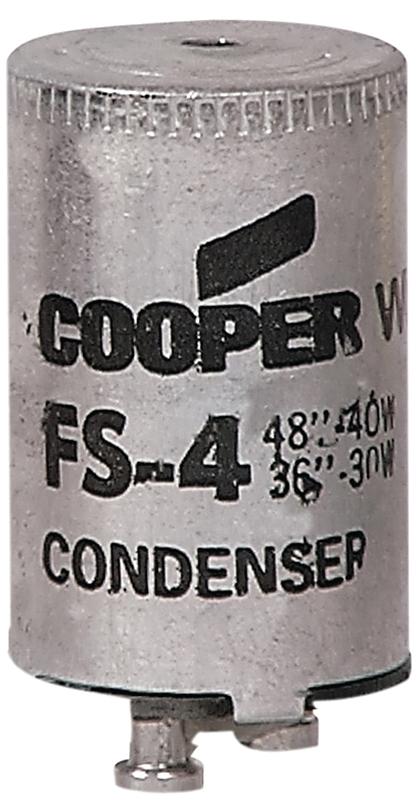 Fluorescent starters - condenser type all-purpose two-terminal standard starter accurately timed to combine starts with long bulb life. For use where lights are turned on more than 5X daily. Also in devices where bulb life expectancy is 2 years or less.