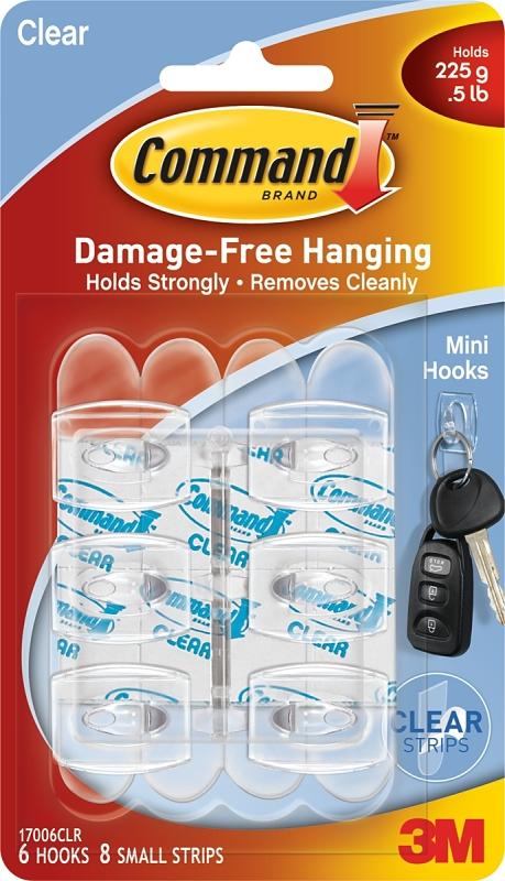 Command™ clear hooks are fast and easy to hang and blend in with most wall surfaces. The revolutionary Command™ clear adhesive strip, holds strongly on a variety of surfaces, including paint, wood, tile and more. Yet, removes cleanly, no holes, marks, sticky residue. Each clear mini hook holds up to 225 g. Contains 6 clear mini hooks, 8 small clear strips. Great for hanging keys, calendars and other small objects. Clear design blends in with any wall surface. Removes cleanly if you change your mind. Forget about nails, screws and tacks, Command™ clear hooks are fast and easy to hang. Rehanging them is as easy as applying a Command™ clear small refill strip, so you can take down, move and reuse them again and again.