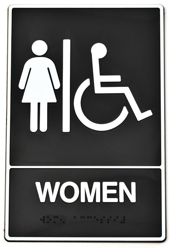 Braille 2 raised lettering and graphics meet ADA requirements. Made of heavy-duty plastic with contrasting eggshell finish and self-adhesive tabs. Packaged for the customer to feel the contour of the sign. Sign shows handicap symbol and states "WOMEN".