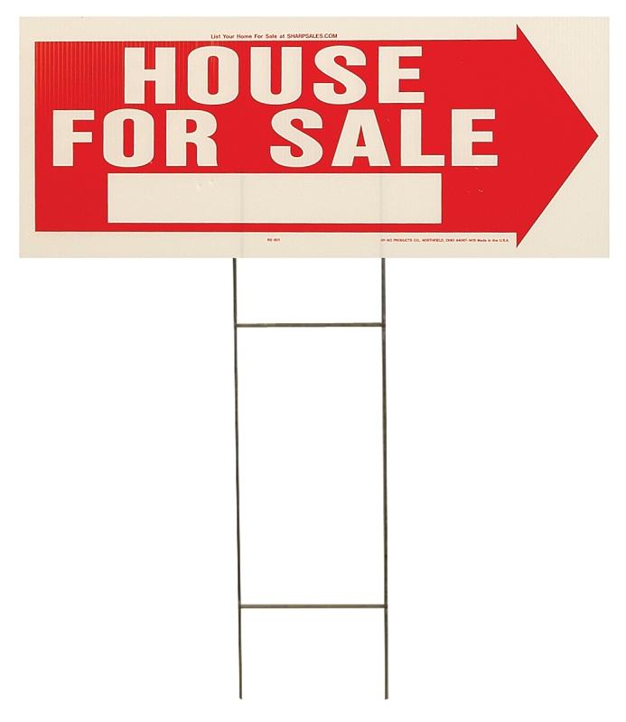 2-Sided, weatherproof. Includes one 24 in mounting bracket made of black steel, inserted between the corrugated openings. Sign states "HOUSE FOR SALE".