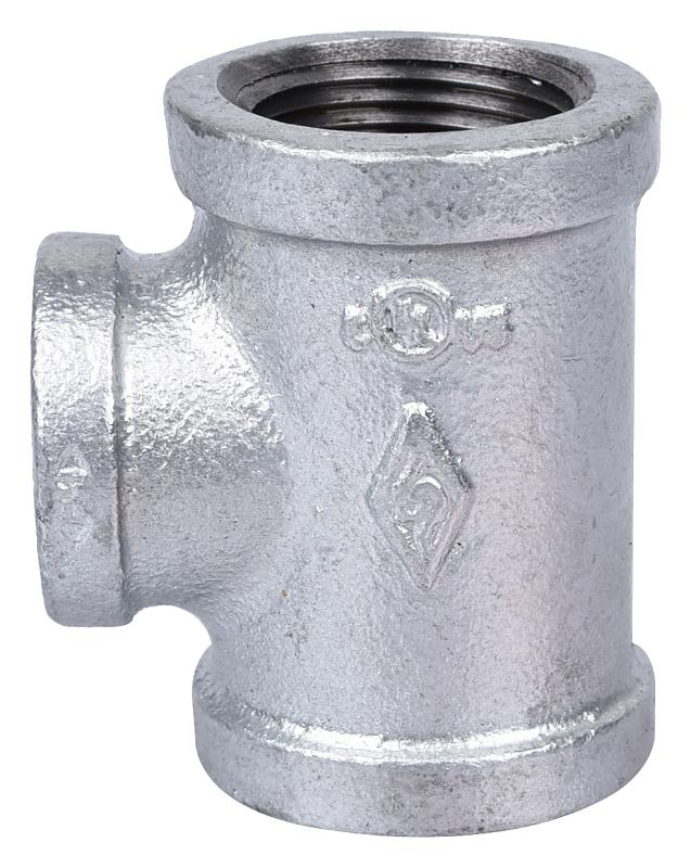 This galvanized tee is used to change direction in piping for use with water or steam. It meets ANSI standard with flat banded, right hand threads standard screw.