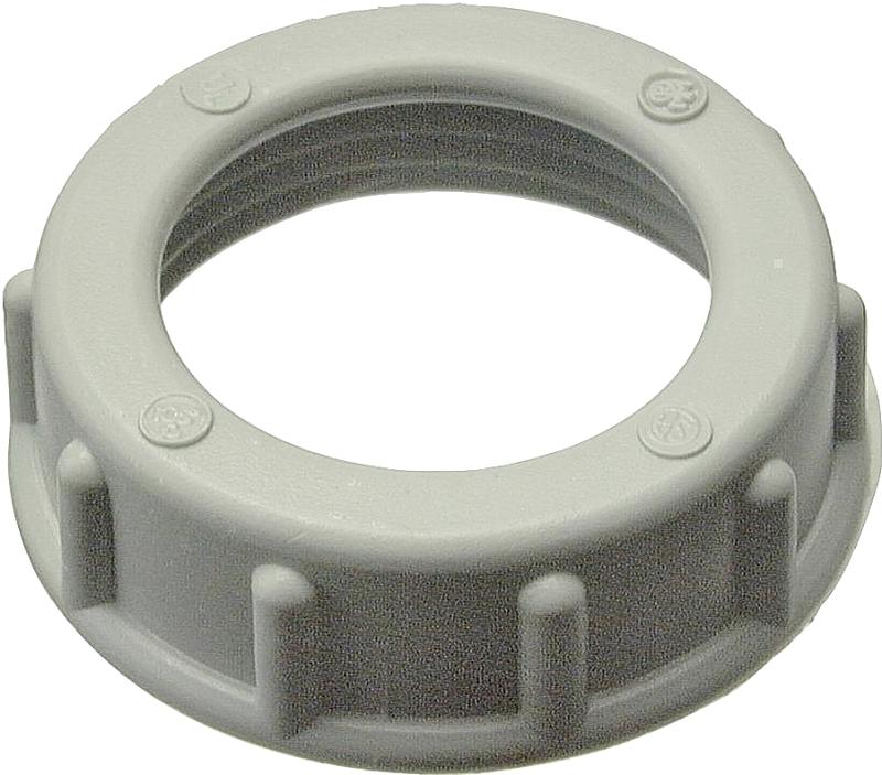 High-impact thermoplastic. Flame retardant to 105 deg C. Use with locknut to terminate threaded Rigid or IMC conduit to an outlet box. The rounded surface of the bushing prevents damage to wire insulation. Required by the NEC. UL listed and CSA approved.