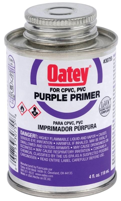 Oatey purple primer is an NSF listed, aggressive primer for use on PVC and CPVC pipe and fittings.