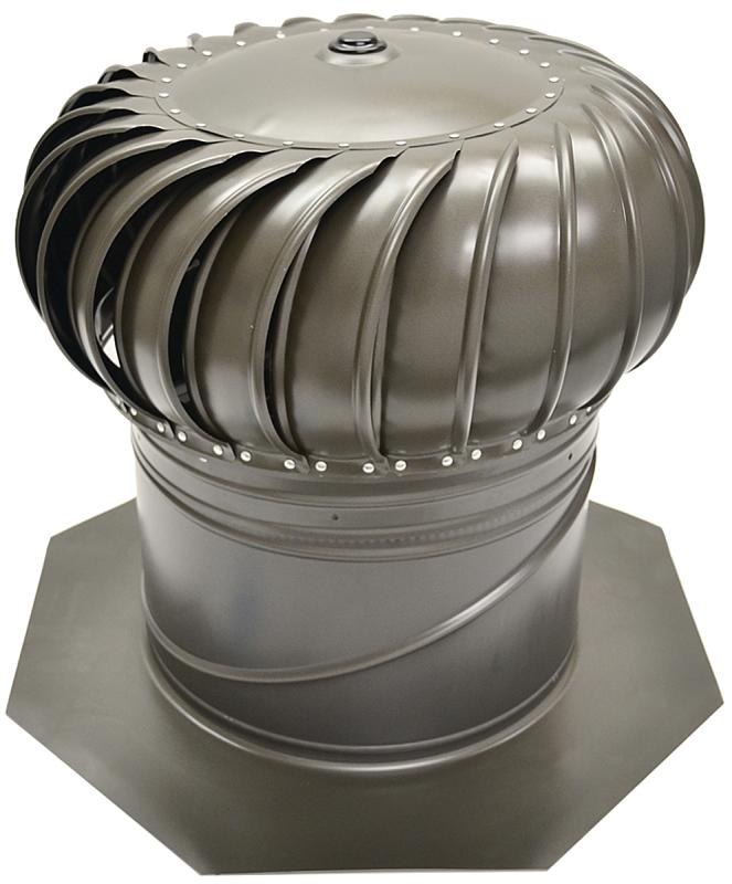 Permanently lubricated track system, upper and lower stainless steel ball bearings prevents metal-to-metal contact, encased to help prevent dirt, dust, sand and other foreign materials from damaging bearings for long life, less friction, smoother spin and wear resistance. Heavy-duty steel spider braces and case-hardened steel shaft for long-lasting strength/durability. Simple, mechanically-locked, two-piece head/base for faster, easier installation. Pre-punched bottom/crimped collar of one-piece base fits tighter, makes installation easier and allows for adjustability up to 12/12 pitch without removing turbine. Extra-large flashing and head with included bottom ring for easier installation and better weather protection. Double ribbed vanes, with convex top, direct even wind-driven rain away from the unit. Dade County/Texas Department of Insurance approved.