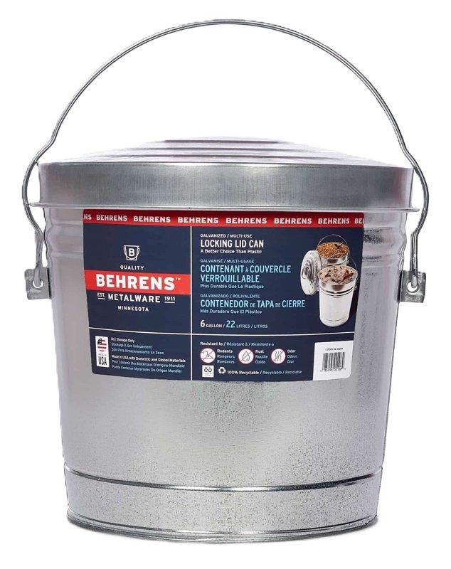 Locking lid can seals tightly to keep contents from spilling. For pet food, bird seed, grass seed, bedding and trash. Rodentproof and won't absorb odors. Large handle for easy transport and a wire reinforced rim. Rust/fire/Heat-resistant. Will not crack or fade like plastic. Made in USA.