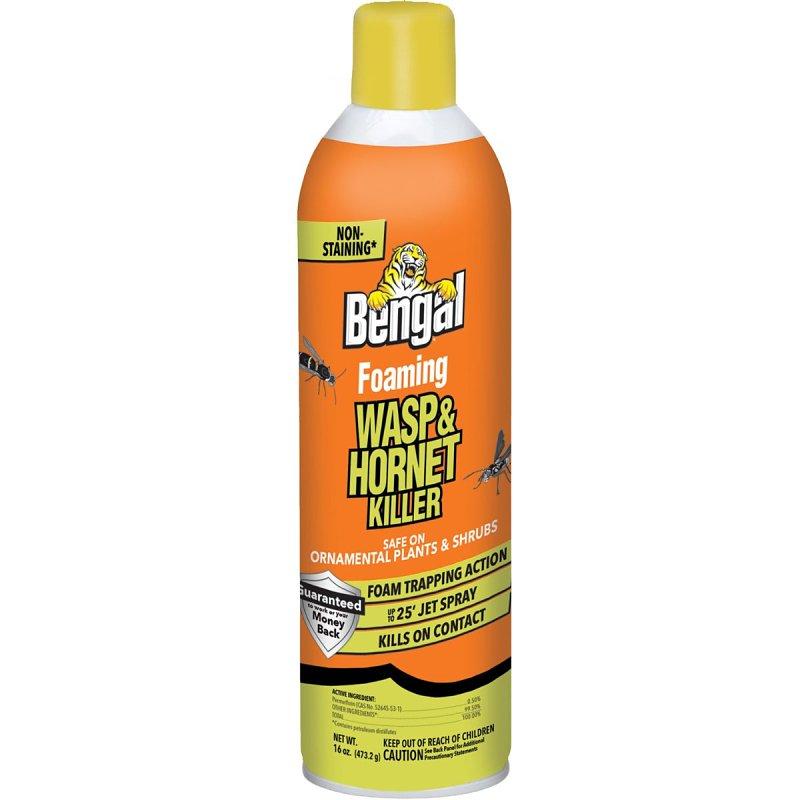 Foam trapping action sprays up to 25 ft. Kills on contact and kills returning insects. Safe on ornamental plants and shrubs. Non-staining to most siding and asphalt shingles. Water-based foam. Active ingredient is permethrin.