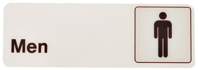 Wipe clean polished finish. Self-adhesive strips for mounting. Use in factories, hospitals, hotels, offices, restaurants and more. White background with brown lettering/symbol which states "Men".