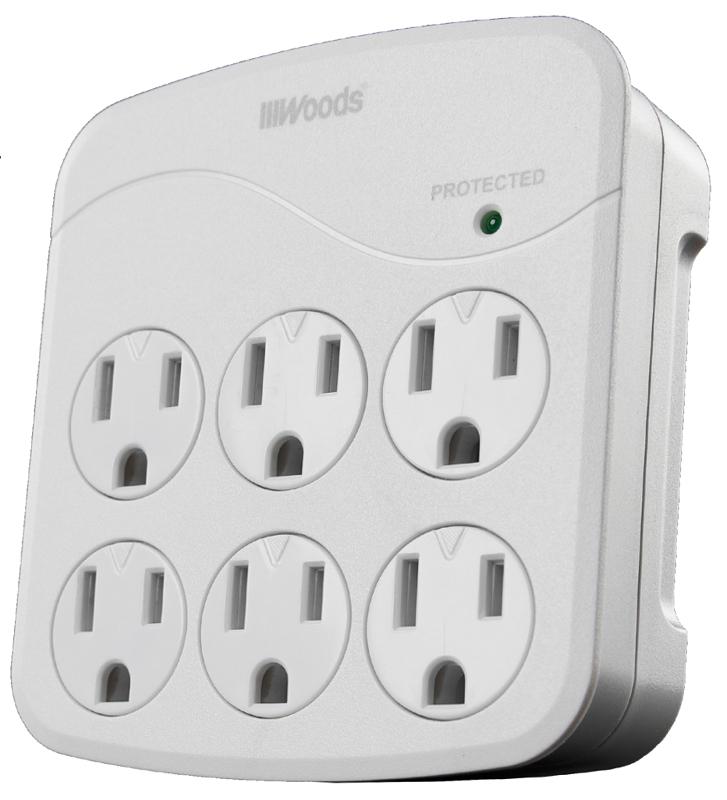 Woods Surge Protector, 15 A, 120 VAC, 1800 W Wattage, 1440 J Energy, 6 Outlets, 45,000 A Peak Surge Current, LED Indicator, White