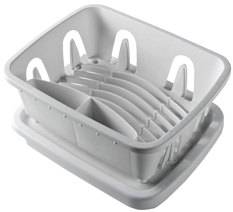 Camco RV mini dish drainer and tray fits RV sinks and is sized just right for limited counter space. Sloped drainer tray keeps counters dry. Drain tray snaps on top of rack for handy storage. Durable heavy-duty construction.