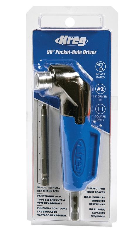 Turn any drill into a 90 deg driver with the Kreg® 90 deg pocket hole driver. This compact drill attachment allows you to drive screws in places you couldn't normally reach with your drill. The included 3 in square-drive bit has a magnetic tip that locks into the head of a pocket hole screw and won't slip out so you can drive screws with confidence, no matter where they are. This attachment works with all hex shank bits, making it great for more than just pocket hole screws. With an ergonomic design, the 90 deg pocket hole driver is easy-to hold in place with one hand while you control the drill with the other. It's also Impact rated for use with an impact driver. Whenever you need to drive screws in tight spaces, count on the 90 deg pocket hole driver to get the job done.