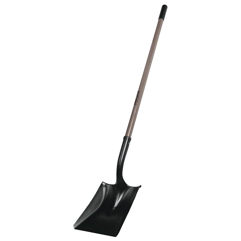 Square point blade shovel with black head, rear steps, steel cover and 47 in fiberglass handle.