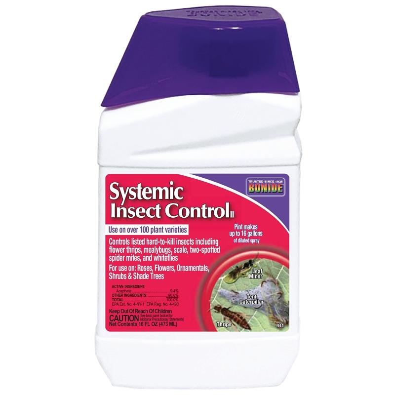 BONIDE Systemic Insect Control kills on contact and systemically, through ingestion. It stops plant damage on many outdoor ornamental plants such as roses, flowers, trees, and shrubs. Can be mixed with fungicides or fertilizer for a combination spray application.