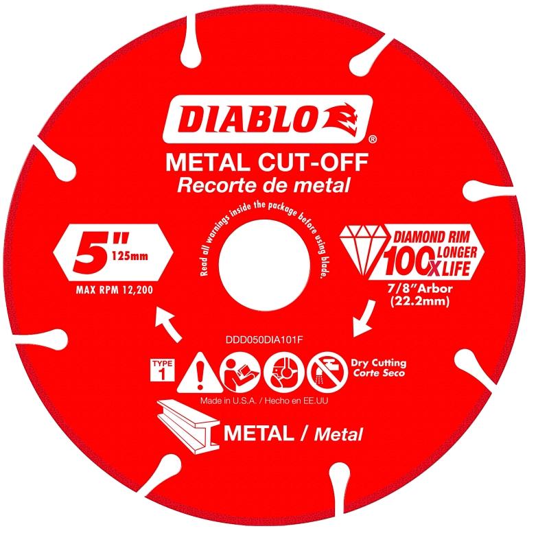 Diamond metal cut-off wheels deliver extreme durability, minimal downtime and increased productivity. These diamond rimmed wheels deliver 100X longer cutting life versus a standard bonded cut-off disc in some of the most intense metal cutting situations. The wheel's long-lasting durability maximizes cutting even in extreme applications such as rebar, angle iron, cast iron and steel bar. Diablo's diamond metal cut-off wheels not only provide long-lasting cutting life, durability and control, but they also allow for a safer cutting experience.