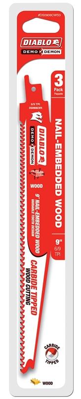 The next generation Diablo demo demon carbide-tipped reciprocating blades with new variable tooth design are specifically designed for maximum performance in nail-embedded wood. This high performance carbide-tipped blade delivers unmatched 50X longer cutting life than bi-metal blades in nail-embedded wood.