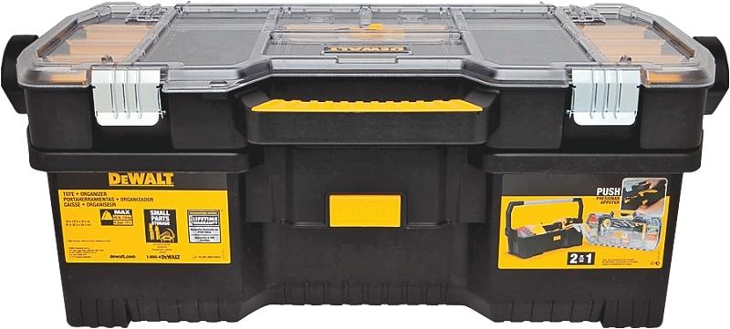 This tool box from is two-storage units in one - a handy jobsite tote for tools and supplies and a detachable organizer for small parts. The two units snap together for easy transport to and from the jobsite.